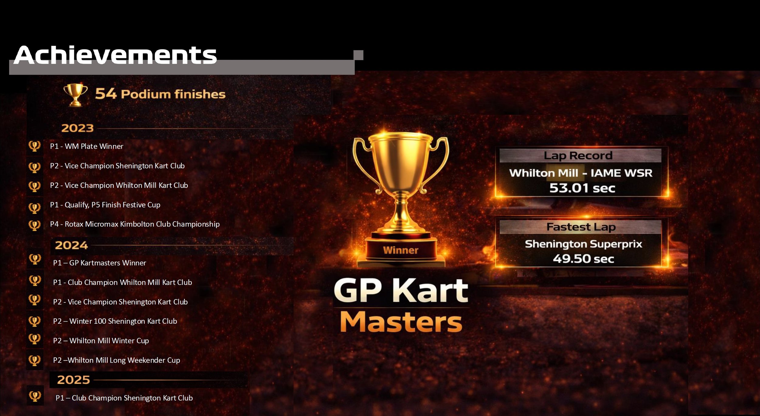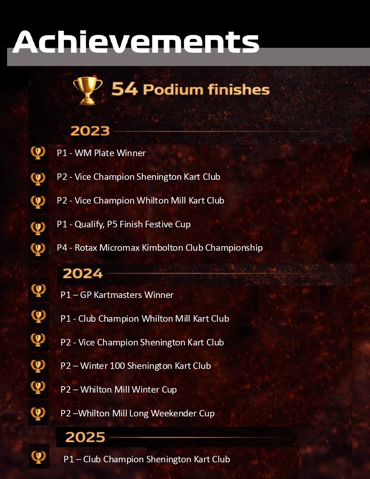 In 2024, Alessandro delivered a standout season, winning the Whilton Mill Club Championship, securing another Vice Champion finish at Shenington, winning the Kartmasters WM Plate at the British Grand Prix, taking pole position at the PFi Festive Cup, and achieving multiple front running results.